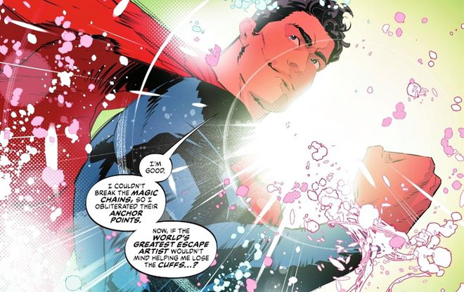 Como dito, assim que ele fica preso ao feitiço, não consegue se desvencilhar porque não compreende como isso pode acontecer. Contudo, ele demonstra que há maneiras de navegar nessa vulnerabilidade ao usar seu rápido raciocínio e a força kryptoniana, mesmo deixando as algemas místicas intactas.