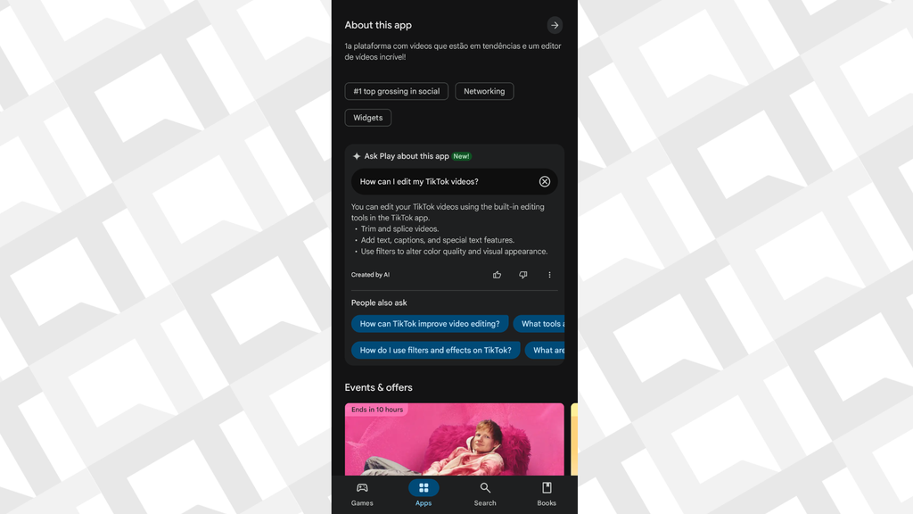 Ao acessar a Play Store em um celular Pixel em inglês, é possível tirar dúvidas sobre apps com a IA do Google. A página de cada software mostra uma série de perguntas relacionadas para tomar a melhor decisão antes de baixar ou atualizar.