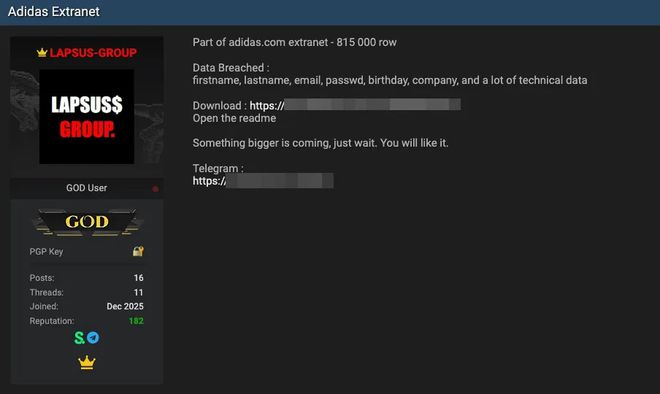 Grupo hacker Lapsus$ alega ter violado dados sensíveis da Adidas (Imagem: Reprodução/Daily Dark Web).
