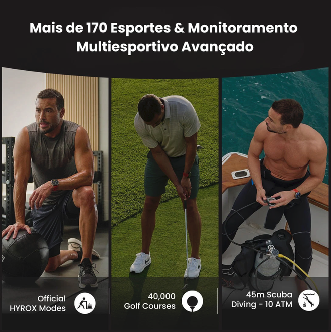 O design combina alumínio, tela AMOLED de 1,5″ com vidro de safira e corpo leve, mantendo certificações militares e resistência de 10 ATM. Ou seja: dá para correr na chuva, treinar com luva ou até mergulhar livremente a até 45 metros.