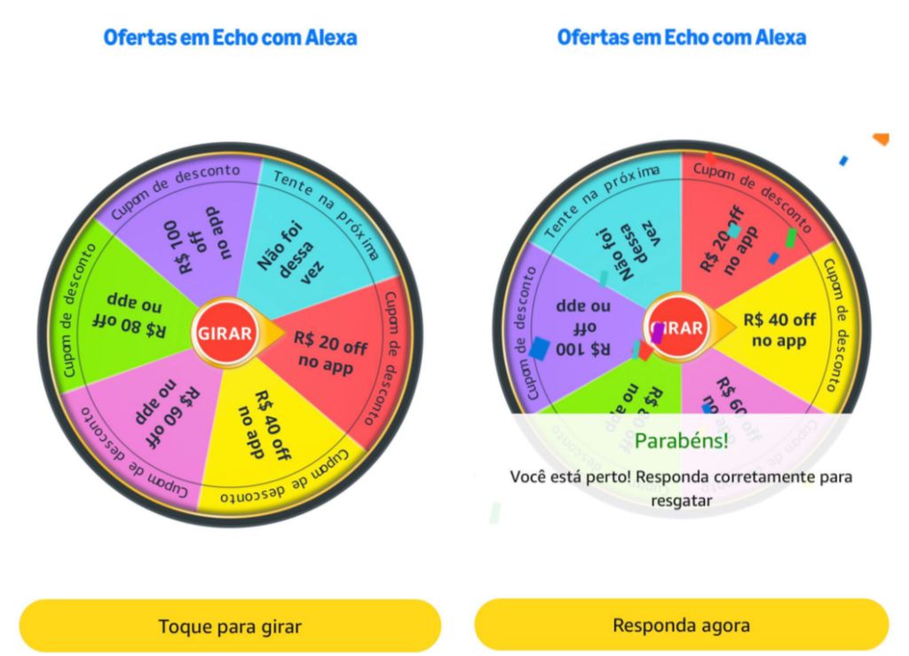 A roleta está disponível dentro do aplicativo da Amazon e aparece em destaque na tela inicial. Ao girar, o usuário pode receber diferentes valores de desconto, sendo o máximo de R$ 100 OFF em dispositivos Echo.