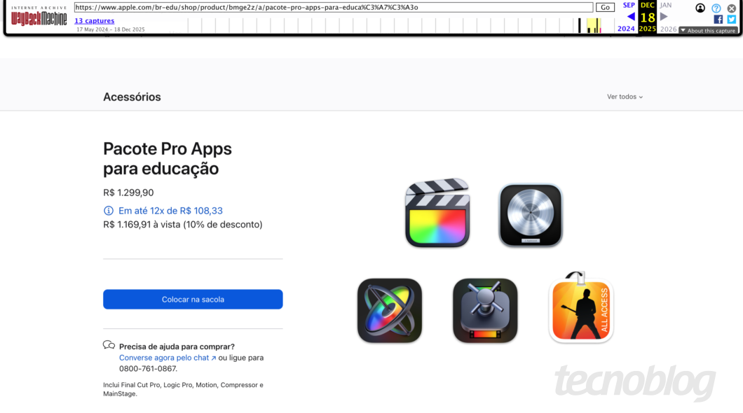 A Apple acabou com o pacote Pro Apps para estudantes, que trazia o Final Cut Pro, o Logic Pro, o Motion, o Compressor e o MainStage para Mac por R$ 1.299. Era um desconto enorme, de quase 70%: para comprar todos separadamente, é necessário desembolsar R$ 4.099,50.