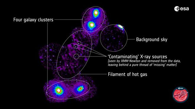 Astrônomos liderados por Konstantinos Migkas, do Observatório de Leiden, na Holanda, identificaram uma grande “mecha” de gás quente ligando quatro aglomerados de galáxias. A formação gasosa é 230 vezes maior que a Via Láctea, e representa a matéria perdida que os cientistas procuravam há décadas.