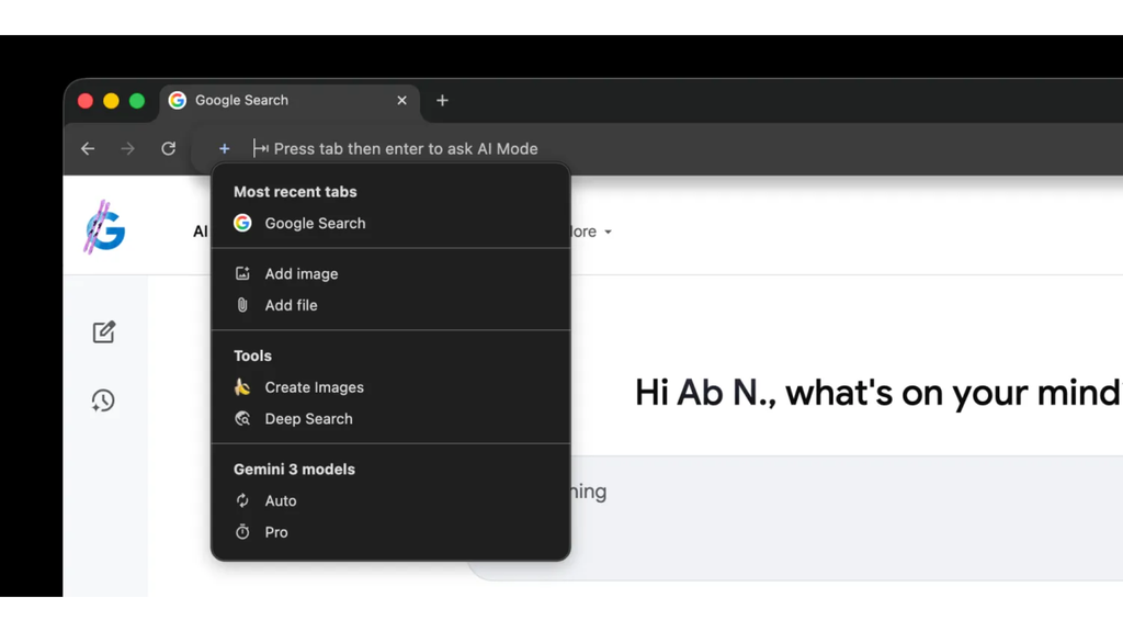 Por padrão, o Chrome permite acessar o Modo IA na busca com o comando Tab + Enter . A mudança inclui um botão de “+” com um menu suspenso para escolher todas as opções — visualmente, é similar ao menu que mostra dados e permissões de um site.