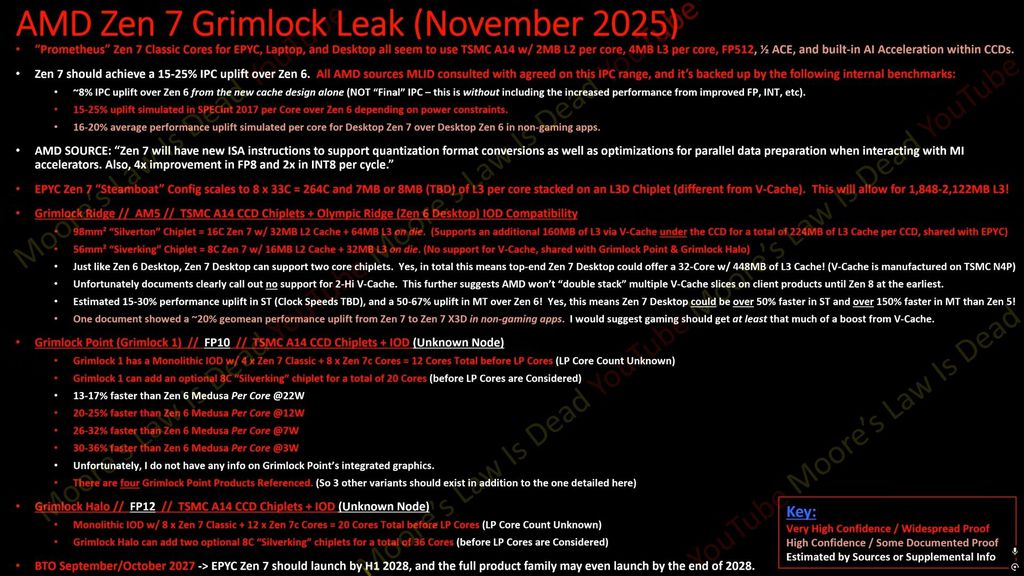 As fontes do MLID afirmam que as CPUs AMD Zen 7 teria aumento de IPC entre 15 a 25% em relação ao Zen 6, que ainda nem foi oficializado pelo Time Vermelho. Desse incremento de performance geracional, 8% seria somente com a implementação do novo design de cache.