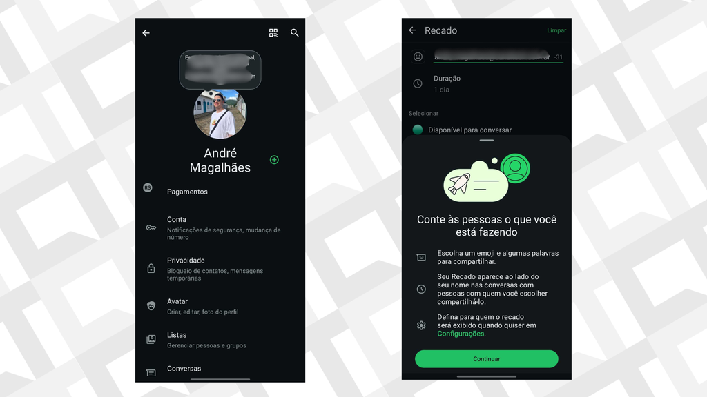 De acordo com uma janela no app, a frase pode aparecer ao lado do nome de perfil nas conversas. O próprio usuário pode escolher quem consegue ver essa informação a partir das configurações do mensageiro.