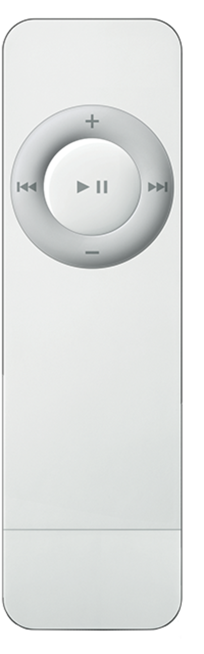 O primeiro iPod a usar memória flash e não ter tela. O foco era na reprodução aleatória (shuffle), com um conector USB embutido e bateria de 12 horas.