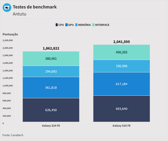 O salto de performance não chega a ser absurdo, como pode-se notar pelos testes de benchmark. Enquanto o S24 FE tem um score de 1.862.822 no Antutu, o S25 FE chega a 2.041.595 pontos – menos de 200 mil pontos de diferença.