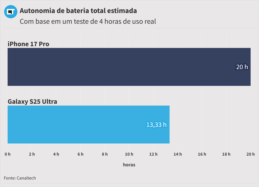 No dia-a-dia, ambos conseguem chegar ao fim do dia com uma única carga em uso moderado. No entanto, o iPhone 17 Pro geralmente termina o dia com mais carga restante.