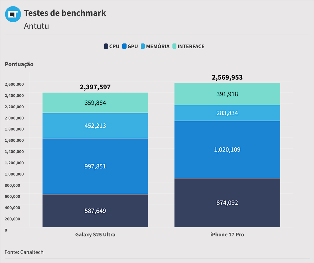 Os dois celulares têm foco em desempenho máximo. O S25 Ultra usa o Snapdragon 8 Elite, e o iPhone 17 Pro estreia o Apple A19 Pro.
