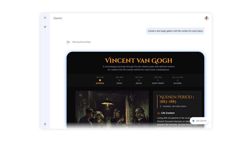 A segunda opção consegue criar uma interface em tempo real, como um aplicativo que roda na web. Como exemplo, o Google pediu para o Gemini criar um espaço para explicar a trajetória de Vincent van Gogh com suas respectivas obras e o pedido foi atendido.