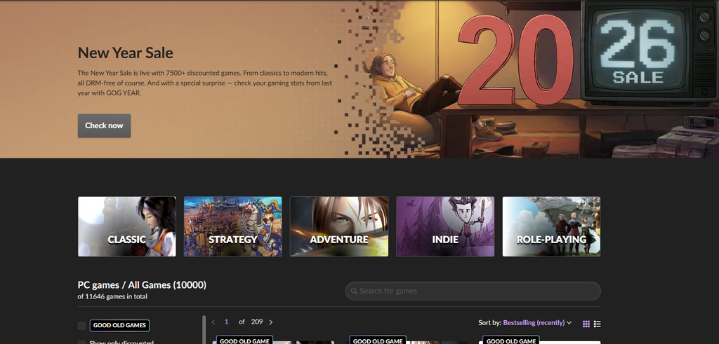 O banner da Promoção de Ano Novo feito com inteligência artificial segue vinculado à página da GOG, apesar das reclamações dos jogadores.