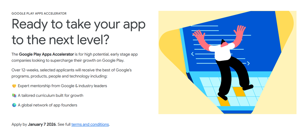 O programa seleciona apenas aplicativos e não inclui jogos. As inscrições são feitas no site da iniciativa (rsvp.withgoogle.com/events/play-apps-accelerator) e os escolhidos serão anunciados em fevereiro de 2026.
