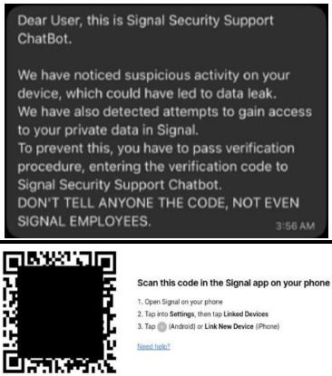 Além disso, há relatos de que os criminosos também pedem para que o usuário escaneie um QR Code para autenticar a conta no Signal. O código, porém, é falso, pois vincula o aparelho da vítima ao servidor do hacker, permitindo que o espião tenha acesso ao histórico de conversas da plataforma e às mensagens enviadas em tempo real.