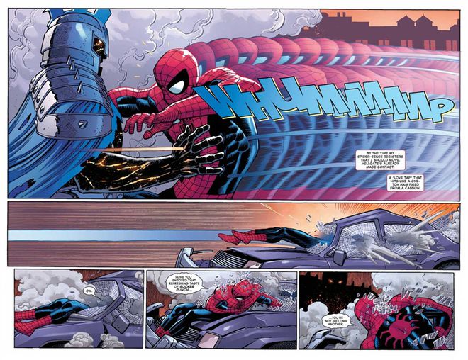 Neste caso o oponente é tão veloz que o aviso chega tarde demais para alguma reação de Peter. E assim, agora temos uma ideia melhor sobre até que ponto o Sentido de Aranha é capaz de antecipar um ataque.