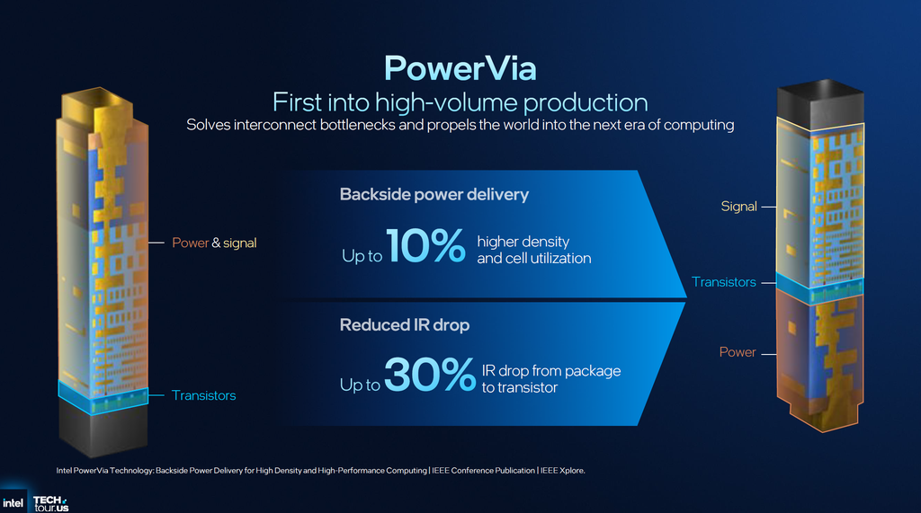 O PowerVia, tecnologia exclusiva da Intel, muda completamente a forma como a energia chega aos transistores, mover as conexões de alimentação para a parte traseira do chip. Essa inovação libera espaço na parte frontal para mais interconexões de sinal, aumentando a densidade de transistores em 30% e reduzindo a queda de tensão (IR drop) em até 30%. Na prática, isso se traduz em mais estabilidade de frequência e mais eficiência energética, fatores cruciais para o desempenho dos Panther Lake.