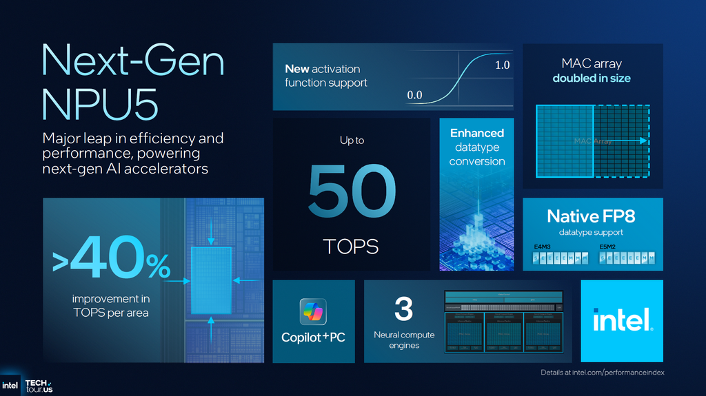 A NPU 5 representa outro salto qualitativo na capacidade de IA dos Panther Lake. Redesenhada com foco em eficiência de área, a nova unidade entrega 40% mais TOPS por área em relação à NPU 4 dos Lunar Lake, mantendo três unidades de processamento neural, mas com arrays MAC duplicados por engine. O suporte nativo a FP8 permite throughput duplicado, enquanto as funções de ativação programáveis através de lookup tables de 256 steps reduzem significativamente a carga nos processadores SHAVE.