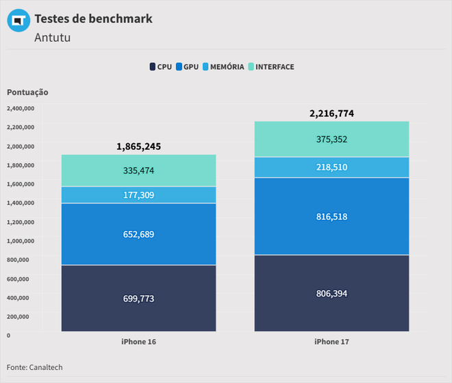 Na prática, o ganho se traduz na redução do tempo de abertura de apps, melhor desempenho gráfico e menor consumo de bateria em tarefas intensas. À medida de comparação, enquanto o iPhone 16 alcança uma pontuação de 1.865.245 no Antutu, o 17 chega a 2.216.774 pontos – uma diferença considerável.