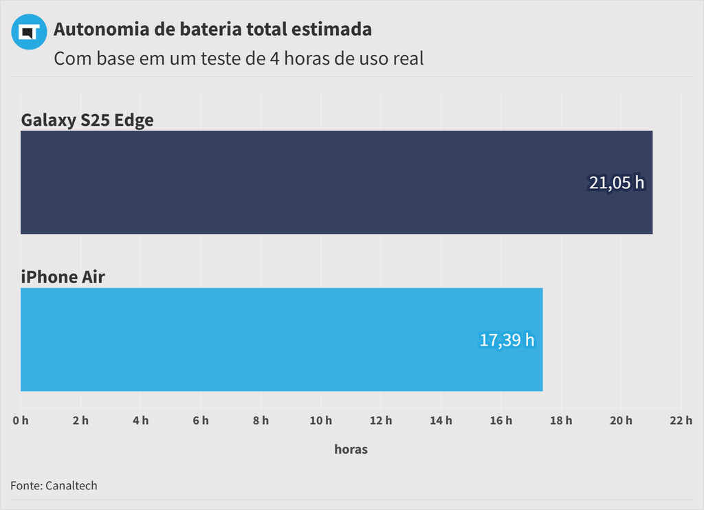 A bateria é o segundo ponto em que foi necessário conceder para o design ser tão fino. O Galaxy S25 Edge tem 3.900 mAh , enquanto o iPhone Air tem 3.149 mAh.