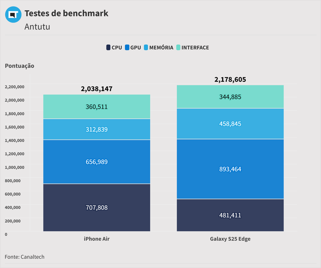 Em desempenho, ambos oferecem o máximo de performance de suas respectivas gerações. O Edge é equipado com o Snapdragon 8 Elite, o mesmo chipset usado no Galaxy S25, S25 Plus e S25 Ultra. Já o Air conta com o Apple A19 Pro, mesmo chip do iPhone 17 Pro.