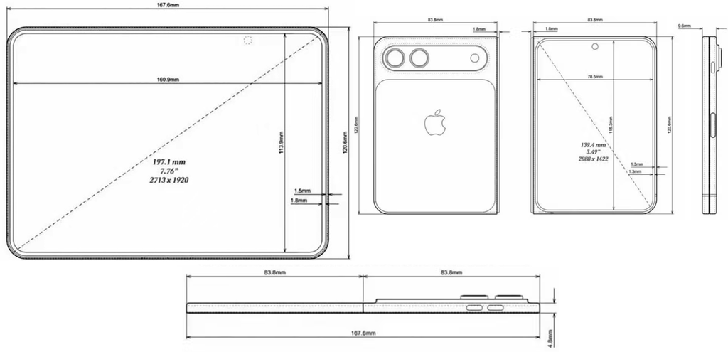 O principal destaque aparece quando o dispositivo é aberto. A tela interna teria dimensões de 167,6 x 120,6 mm, totalizando 7,76 polegadas. Em outras palavras, o iPhone Fold ficaria apenas um pouco menor que o iPad mini, que tem 8,3 polegadas.