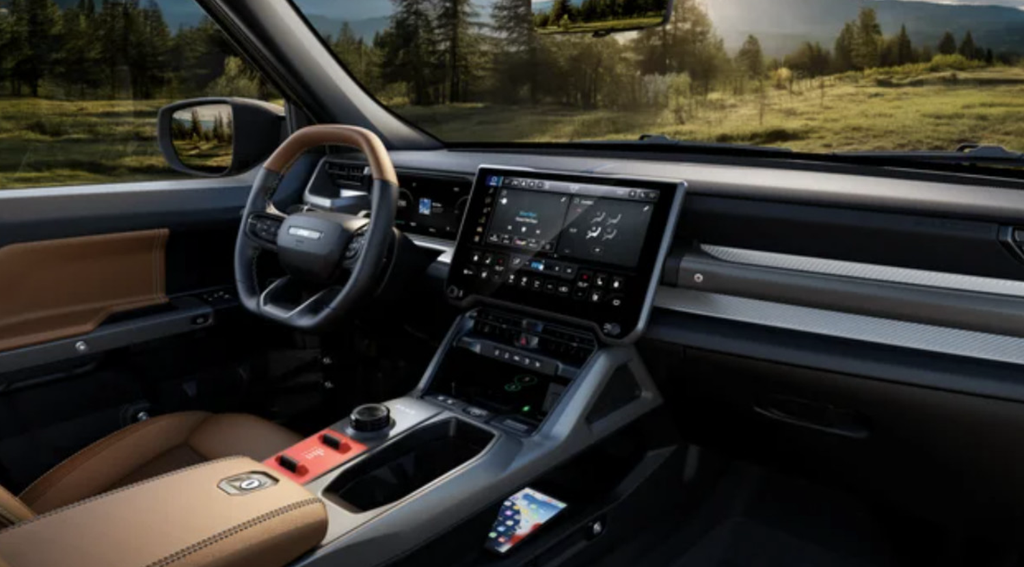 O interior do Recon oferece mais espaço que o Wrangler, destacando-se pelo console central com comandos off-road em botões físicos. A versão Moab vem equipada com itens premium, como teto solar panorâmico, bancos aquecidos, câmeras 360º e pacote de assistência ACC, frenagem automática e sensor de fadiga.