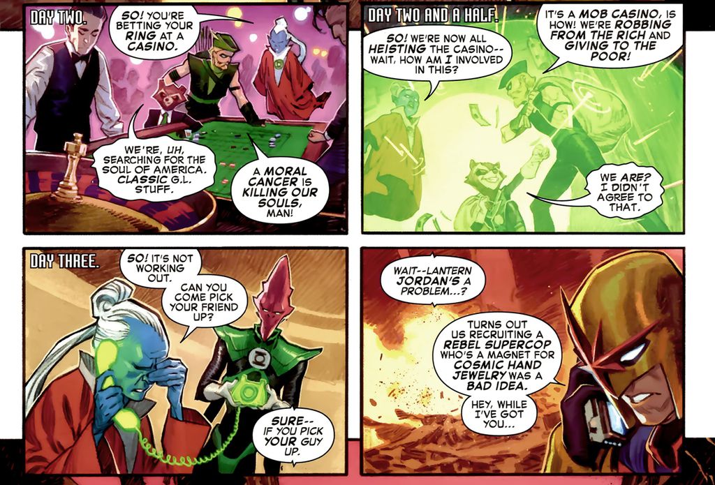 Enquanto Rocket fracassa como Lanterna Verde, a história também mostra Hal Jordan tentando se entrosar com os Guardiões da Galáxia — vale lembrar que tanto Peter Quill quanto Hal Jordan têm semelhanças, pois ambos são inspirados nos “heróis anônimos do Velho Oeste”, a exemplo de Han Solo, de Star Wars.
