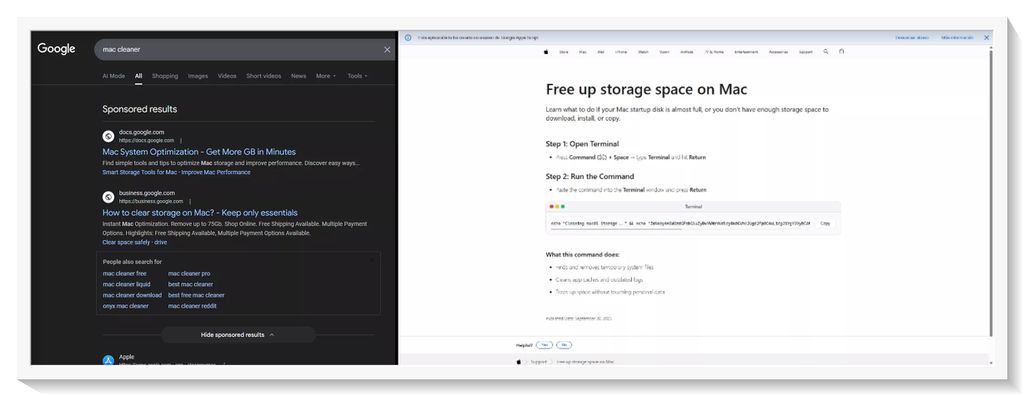 A descoberta foi feita por meio de resultados de busca patrocinados do Google quando o usuário pesquisa “limpeza de Mac” no mecanismo. Uma vez que a pessoa clica no link acreditando estar diante de um recurso legítimo, ela é direcionada para uma página que imita o site de suporte da Apple.