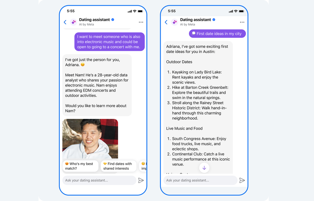 O dating assistant é um chatbot integrado ao Facebook Dating que ajuda os usuários a encontrar combinações mais alinhadas aos seus interesses e preferências. A ideia é ir além dos filtros tradicionais, como altura ou formação acadêmica, permitindo buscas personalizadas e criativas.