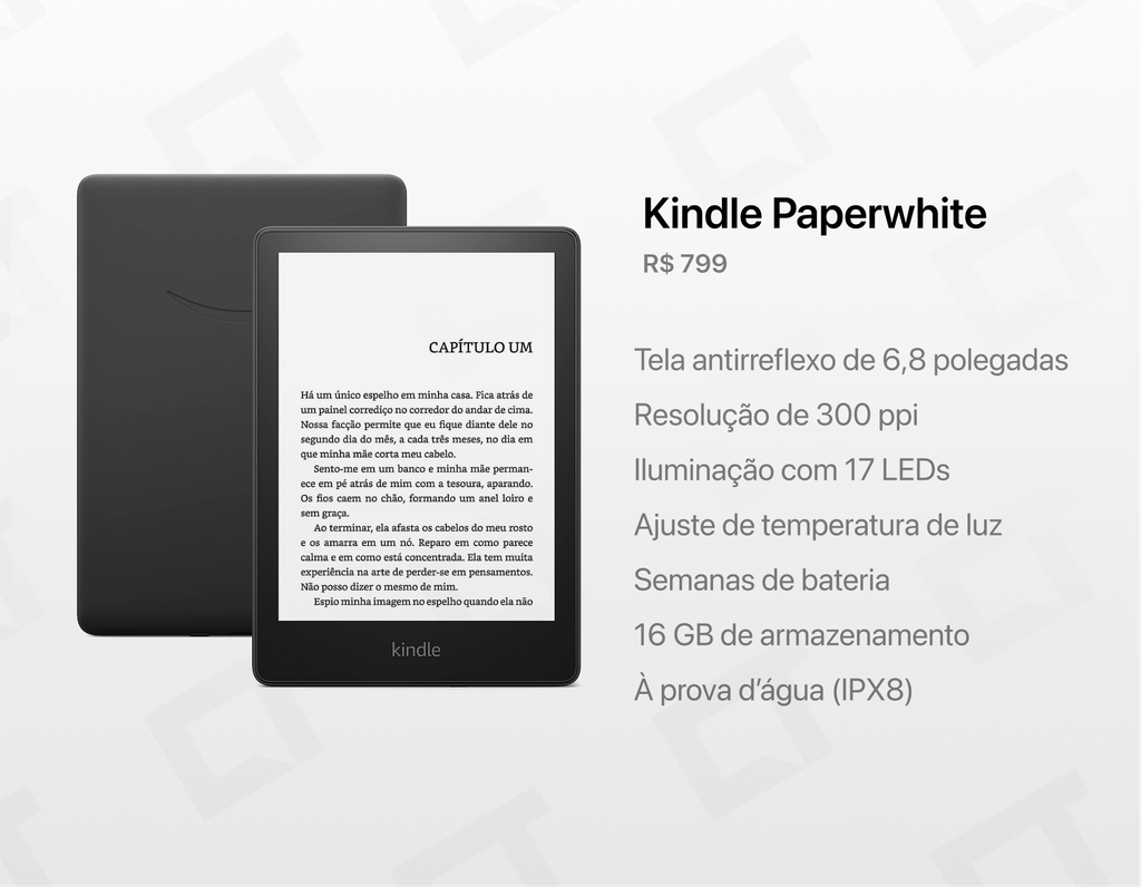 - Resistência à água (IPX8), ideal para ler à beira da piscina, na praia ou na banheira;