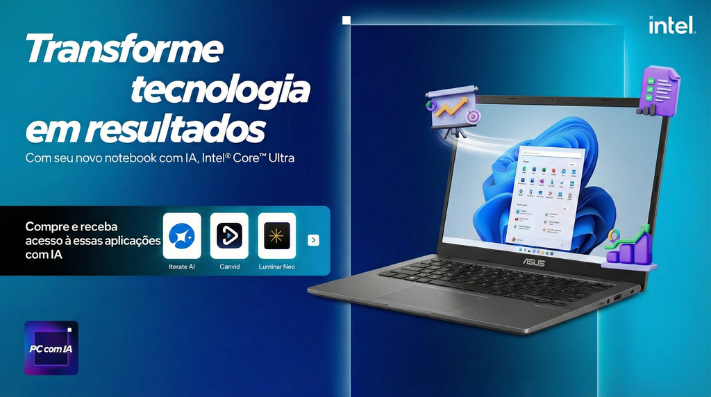Para quem estava esperando o momento certo para trocar de máquina, a hora é agora. A Intel preparou uma campanha especial para este lançamento: comprando o ASUS Vivobook S14 com Processador Intel® Core™ Ultra até o dia 31/12/2025, você ganha acesso a um pacote exclusivo de softwares de IA para maximizar sua produtividade e criatividade.