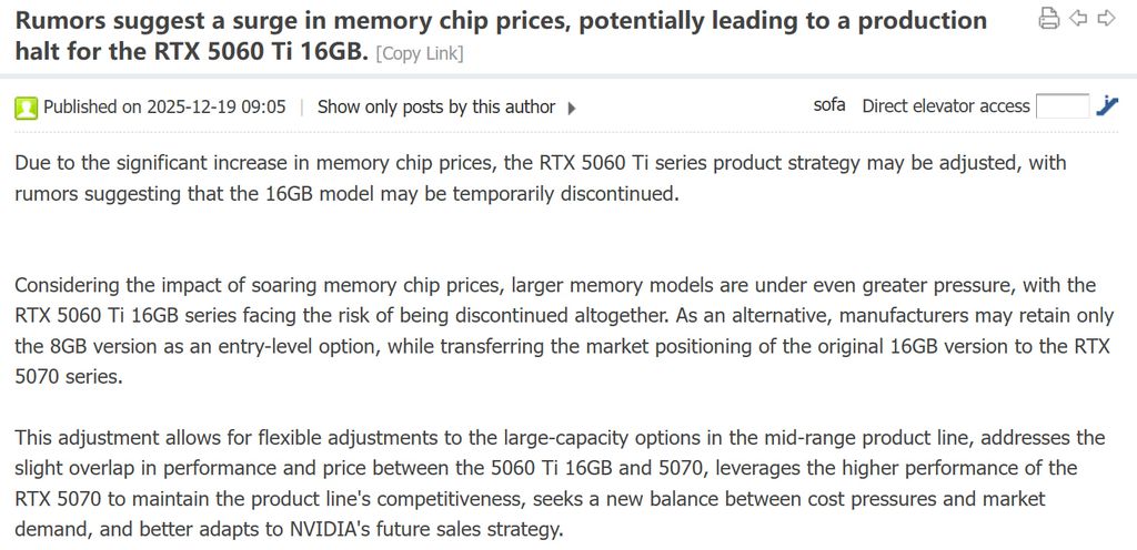 Segundo informações do Board Channels, fórum supostamente frequentado por integrantes da indústria de hardware, “a estratégia de produção da série RTX 5060 Ti deve ser ajustada”, com a descontinuação temporária na produção da versão com 16 GB, mas ainda existe o risco de essa GPU se descontinuada.