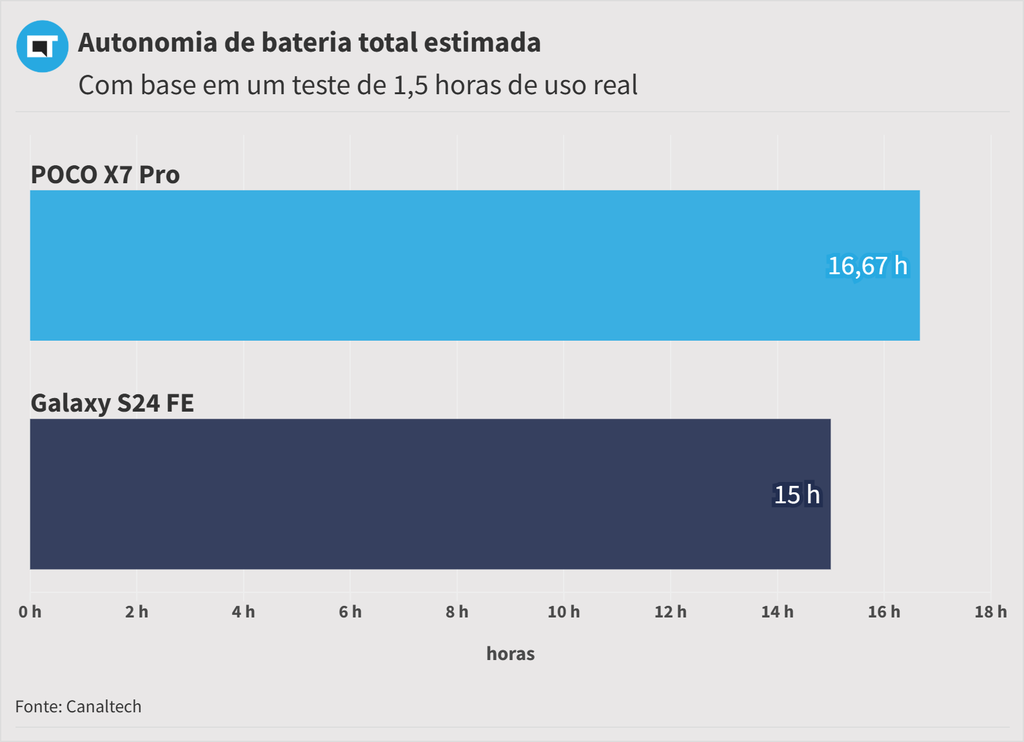 Na prática, o POCO passa muito mais tempo longe das tomadas. De acordo com os testes do Canaltech, ele tem estimativa de duração de 16 horas, enquanto o Galaxy fica em aproximadamente 15 horas.