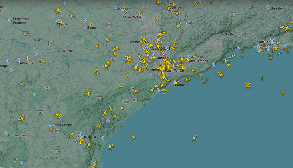 Os aviões se desviam levemente das rotas previstas no oceano (Captura de tela/FlightRadar)