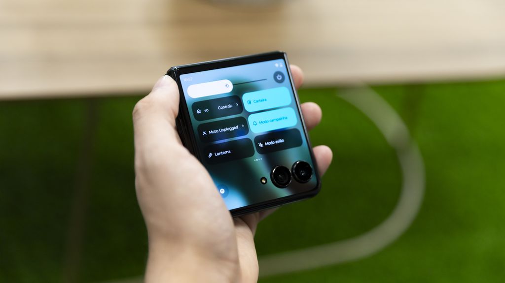 Além do conjunto de câmeras, o Razr 50 Ultra chama atenção pelo design inovador e pela experiência diferenciada de uso com tela flexível. Isso também possibilita usar o conjunto traseiro para tirar selfies.