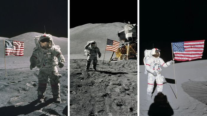 De Neil Armstrong e Buzz Aldrin na Apollo 11 a Eugene Cernan e Harrison Schmitt na Apollo 17, todos os astronautas que pousaram no satélite natural da Terra a bordo de missões da NASA hastearam uma flâmula norte-americana na superfície lunar.