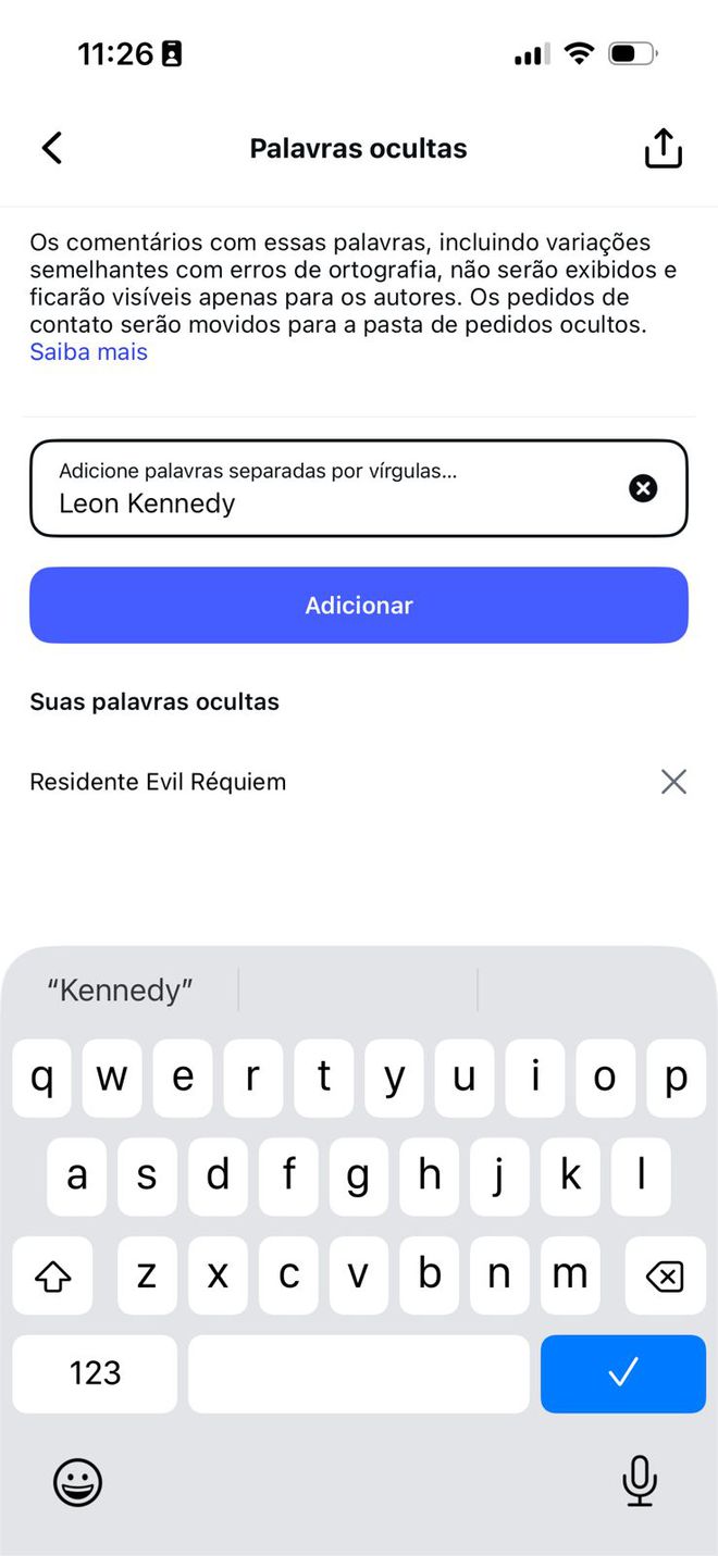 - Adicione os termos. Isso fará com que o Instagram oculte legendas e posts que contenham essas palavras.