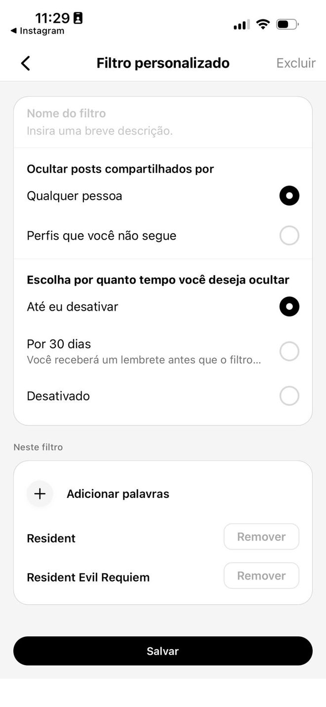 - Toque em Novo Filtro e adicione as palavras.