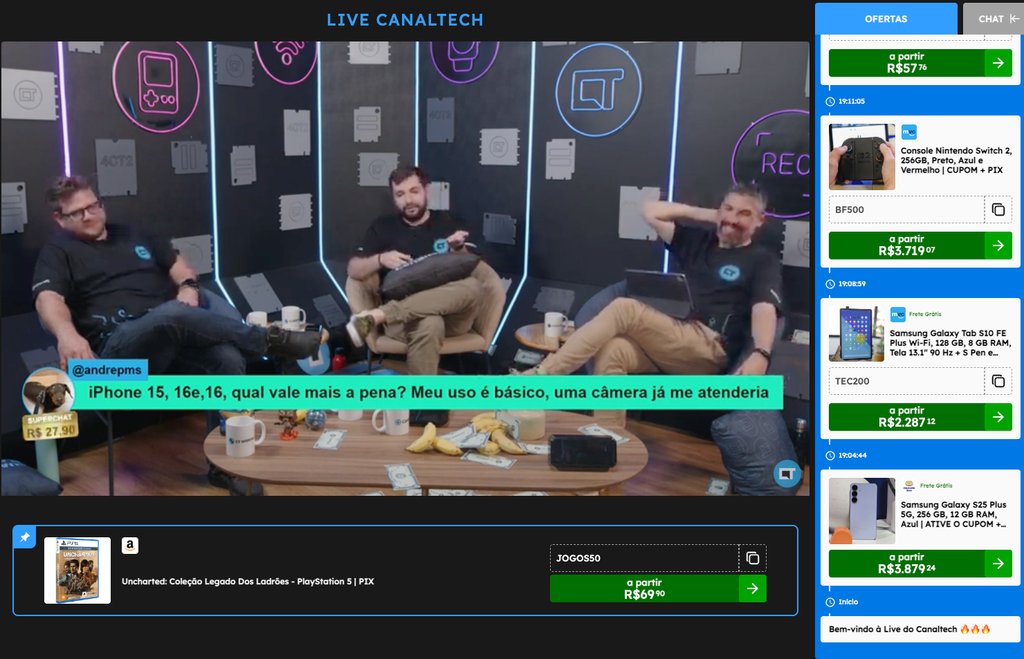 E claro, teve espaço para os “achados” que viralizam na live: o drone que volta sozinho para a mão do usuário, com preço no chão; o Buds 3 Pro abaixo de R$ 1.000; o DualShock 4 atingindo seu menor histórico; e até hardware pesado, como RTX 5060 e Radeon RX 7800 XT, ambas com valores inéditos para quem queria turbinar o setup ainda em 2025.