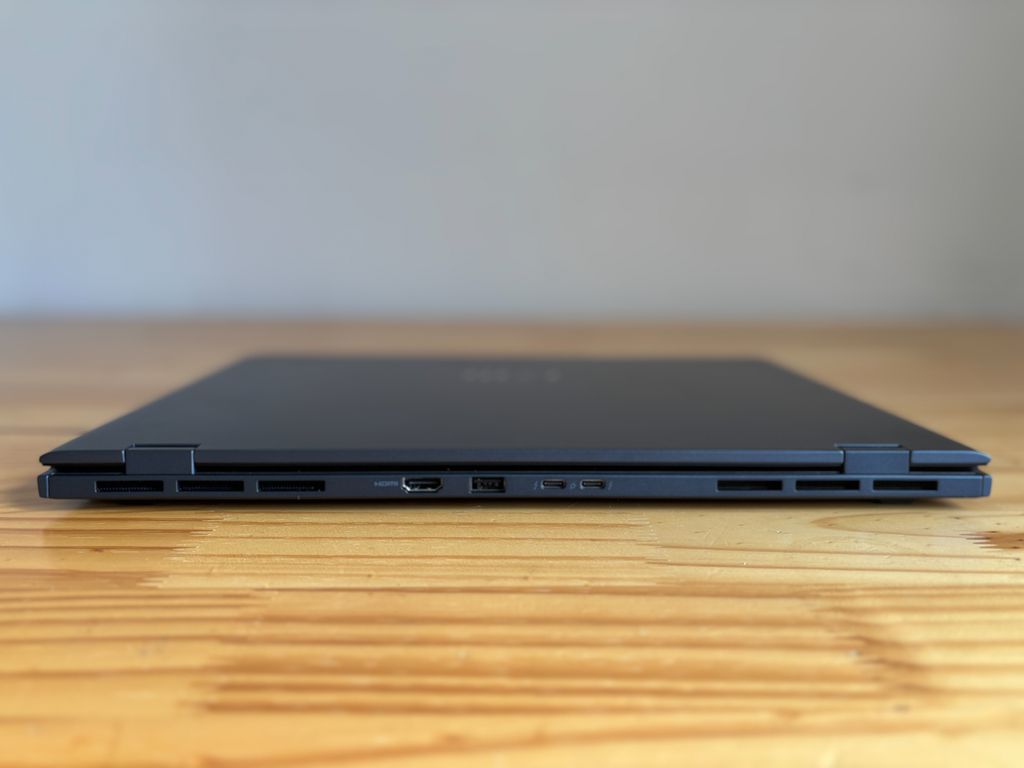 Como a maioria dos Copilot+ PCs, esse modelo da MSI também oferece poucas portas USB. As duas portas USB-C Thunderbolt 4 (com suporte a DisplayPort e carregamento), USB 3.2 Gen 2 e HDMI 2.1 ficam na parte de trás do notebook. Em um dos lados, temos um leitor de cartão, RJ 45 e conector de áudio. A escolha pelas principais conexões na parte de trás é algo positivo, já que não fica nada à mostra nas laterais. Mesmo assim, são poucas portas.