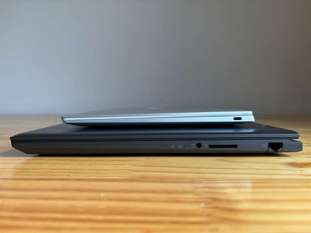 - Conexões: leitor de cartão SD, HDMI 2.1, RJ45, USB-A 3.2 Gen 2, 2x USB-C Thunderbolt (DisplayPort e energia)
