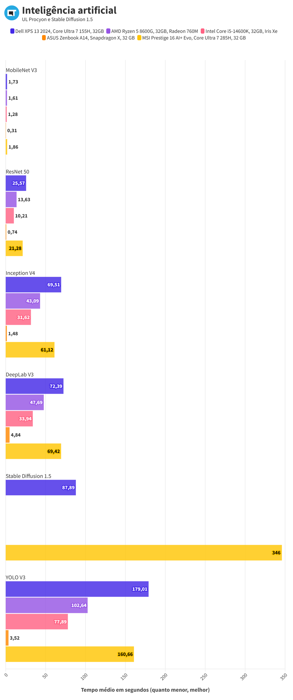A bateria de testes com IA trouxe resultados curiosos. O Core Ultra 9 285H não consegue superar um Core Ultra 7 155H, CPU mais fraco e de geração passada. Não foi possível identificar algum tipo de anomalia acontecendo nesses testes, então fica difícil de entender o que aconteceu aqui.