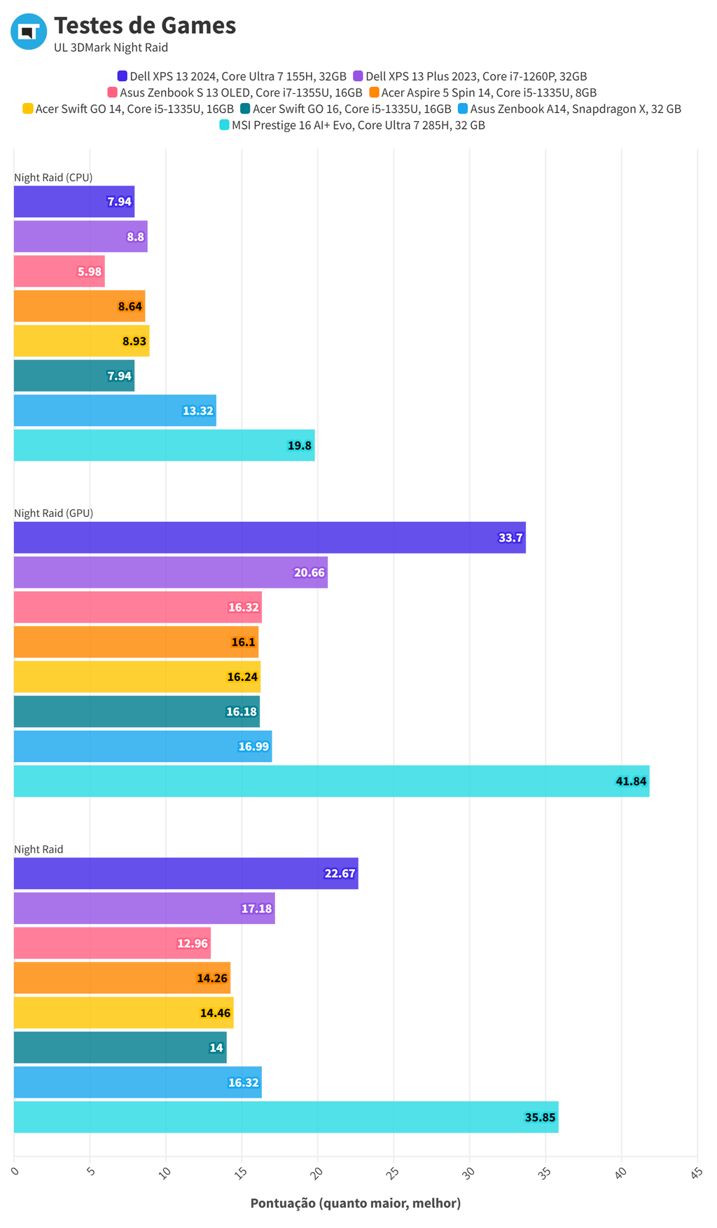 Rodamos o teste Night Raid do 3DMark, voltado para processadores com gráficos integrados mobile, para saber o potencial dessa CPU em jogos, embora esse não seja o foco desse tipo de notebook. Mesmo assim, o Intel Core Ultra 9 285H se mostrou muito promissor com o sua iGPU Arc 140T, assumindo a liderança em nossos testes.