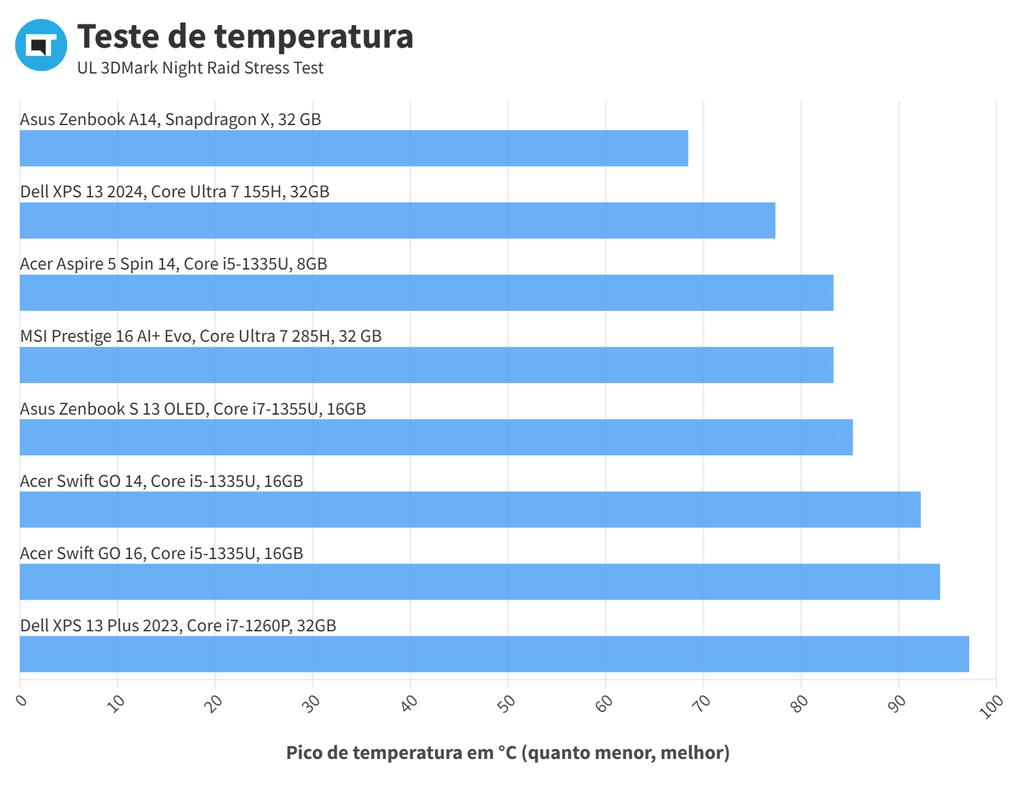 Em nosso teste feito no Procyon, em que é simulado o uso do notebook com tarefas diferentes até exaurir a bateria, foi possível atingir quase 17 horas, que é equivalente a dois dias de trabalho normais. O teste é mais intenso, drena mais a bateria, mas em minha experiência foi possível chegar a cerca de 20 horas de autonomia, mesmo com videochamadas breves de vez em quando.