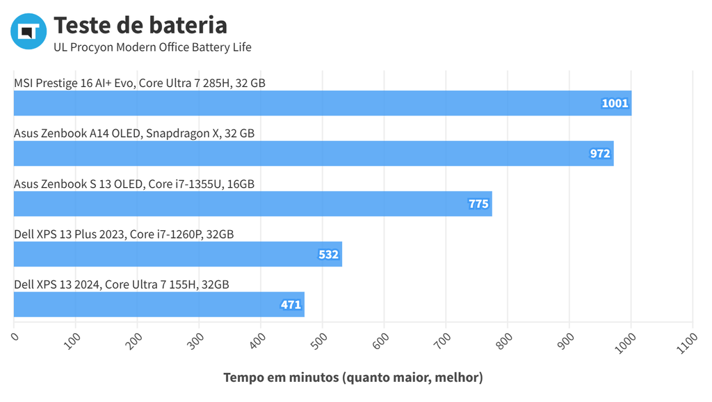 Aqui temos um resultado interessante, e ele está atrelado mais à eficiência do Core Ultra 9 285H do que à capacidade em si potência da bateria. Como a maioria dos Copilot+ PCs, o MSI Prestige AI+ Evo também faz bonito na autonomia de bateria. No uso normal do dia a dia, considerando 8 horas diariamente, você normalmente precisará carregá-lo somente no terceiro dia de uso.