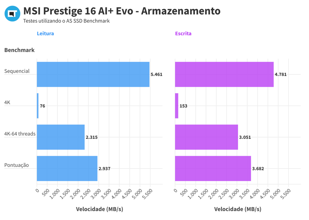 Com suporte a PCIe 5.0, o SSD de 1 TB padrão do MSI Prestige AI Plus Evo entregou altas velocidade de escrita e leitura. No uso do dia a dia, isso se reflete em mais produtividade, porque o notebook realmente inicia o sistema e abre tudo muito rápido.