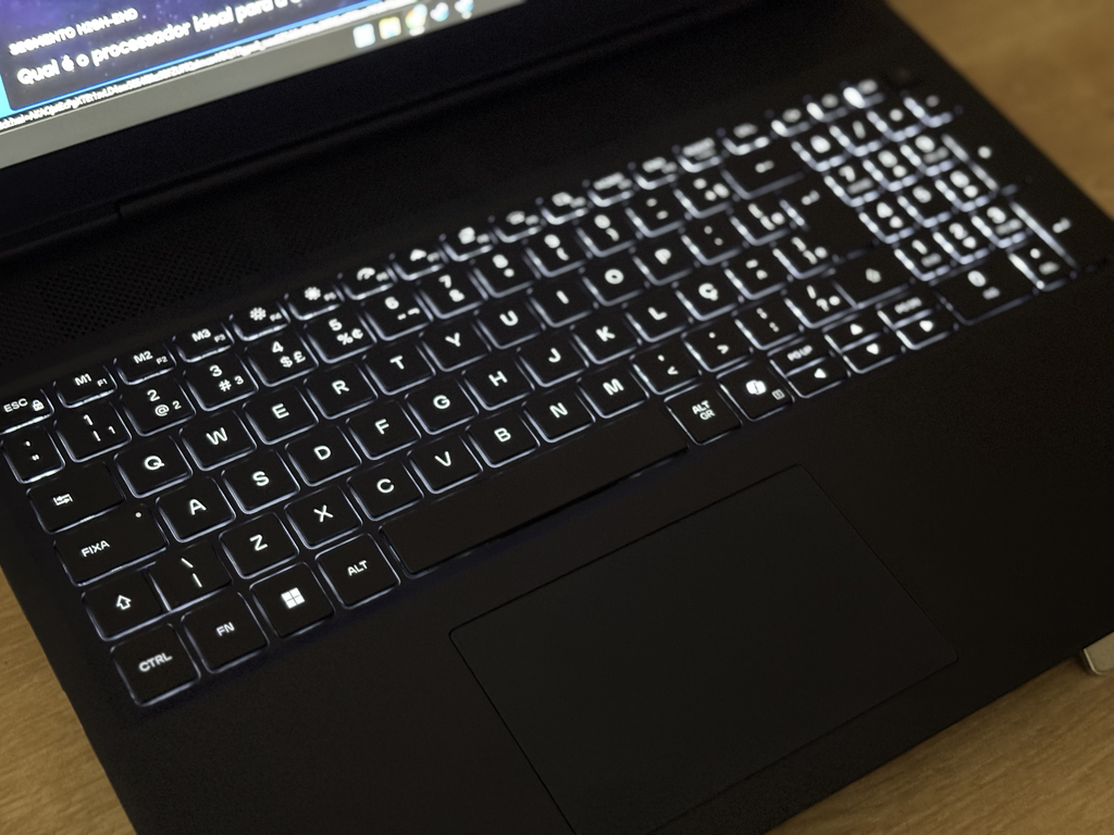 O teclado tem iluminação na cor branca, como dito antes, que ajuda em ambiente escuros, e que não faz diferença durante o dia (mal dá para ver a iluminação com muita luz). Para a digitação, o corpo do notebook proporciona um bom espaço para descanso dos pulsos, essencial para uma jornada de horas de trabalho.