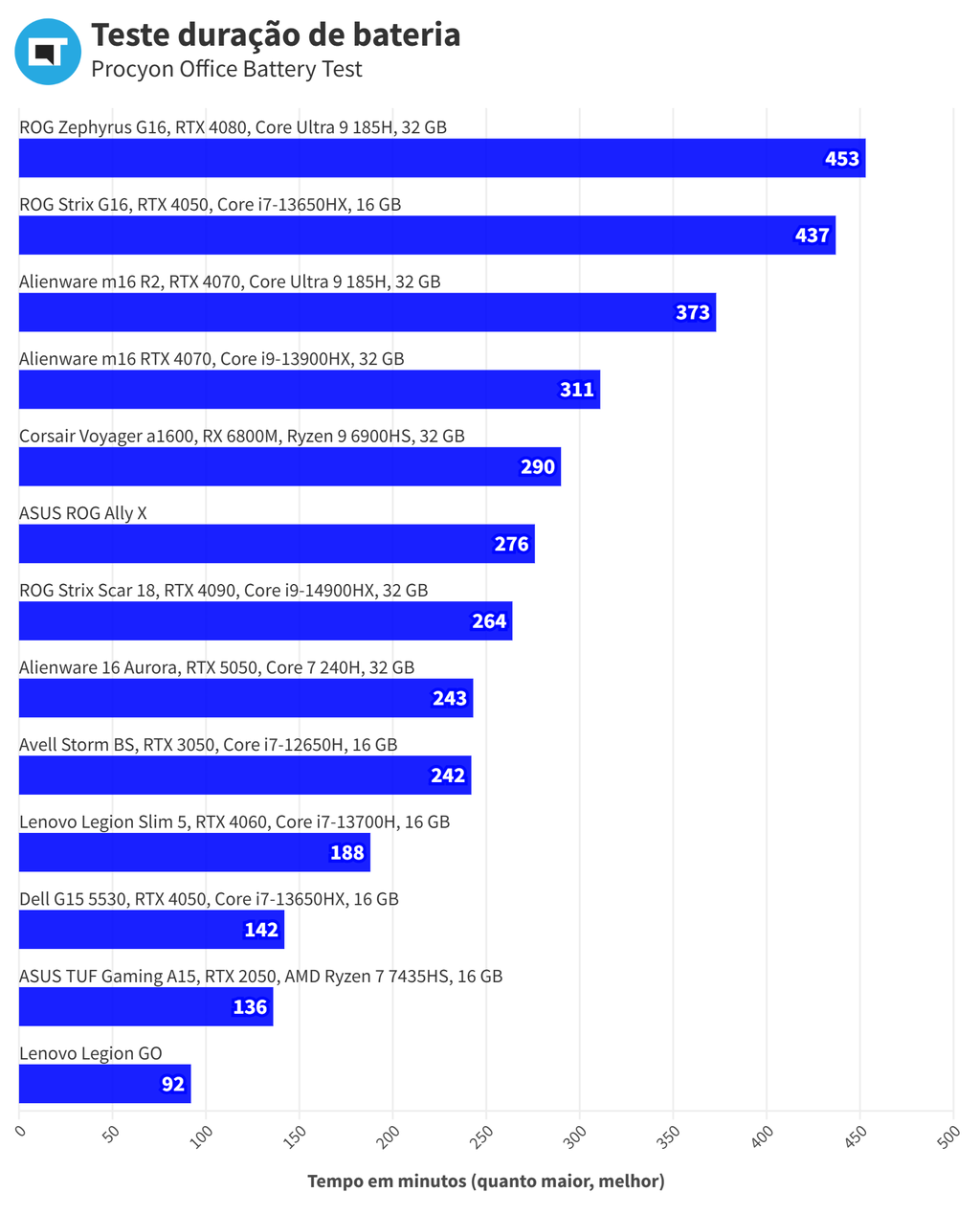 Para a configuração que recebemos, com foco na RTX 5050, Core 7 240H e 32 GB de memória RAM, o Alienware 16 Aurora vem com uma bateria de 96 WHr, que tem autonomia de pouco mais de 4 horas em nosso teste de estresse. Diferente dos notebooks ultrafinos, com chips modernos com grande foco em eficiência energética, esse notebook não prioriza isso, mas sua bateria dura o suficiente para você correr e conectá-lo na tomada. No fim das contas, não dá para esperar muito de um notebook gamer nesse sentido.