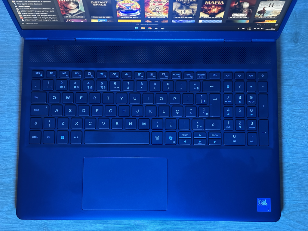 Já o touchpad proporciona bom deslize dos dedos, tem suporte a multitoque e rolagem. Ele fica posicionado logo abaixo da tecla de espaço e ALT GR, pegando um pouco da tecla dedicada para o Copilot. É um bom tamanho, mas confesso que touchpad em um notebook gamer é o de menos, principalmente para a jogatina, onde não é usado, já que o mouse é um item praticamente obrigatório. Então a funcionalidade integrada fica mais para usos pontuais.