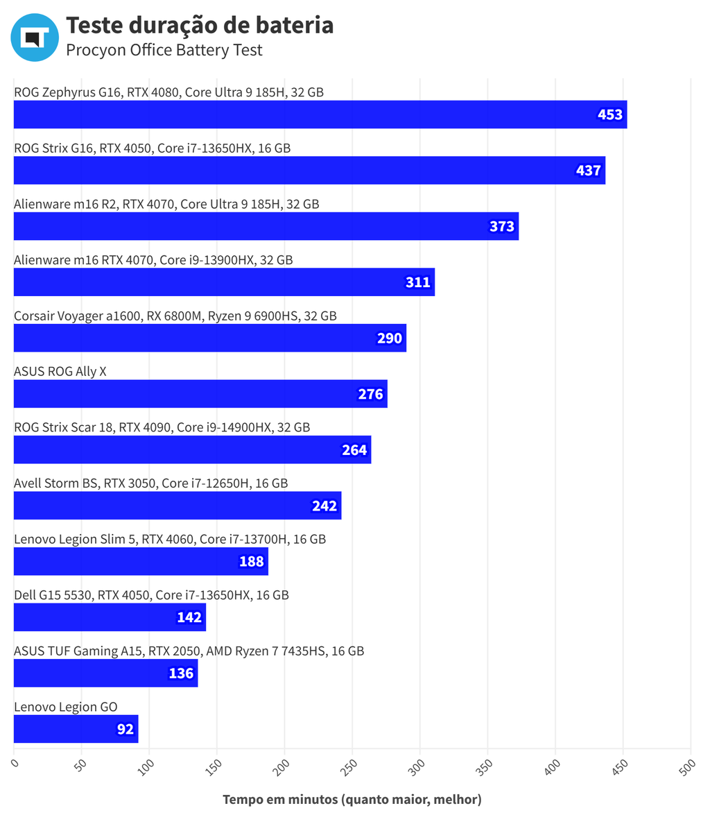 Esse modelo é equipado com uma bateria de 48 Whr, com 3 células de íon de lítio e autonomia bastante limitada. No teste do Procyon, que simula um uso comum abrindo e-mail, programas do pacote Office, rodando vídeos e alternando entre todas essas tarefas, o resultado que tivemos foi de 2 horas e 16 minutos, algo muito longe do ideal para quem pretende trabalhar nesse notebook. No dia a dia, você vai precisar carregá-lo umas duas vezes durante um expediente normal de trabalho.